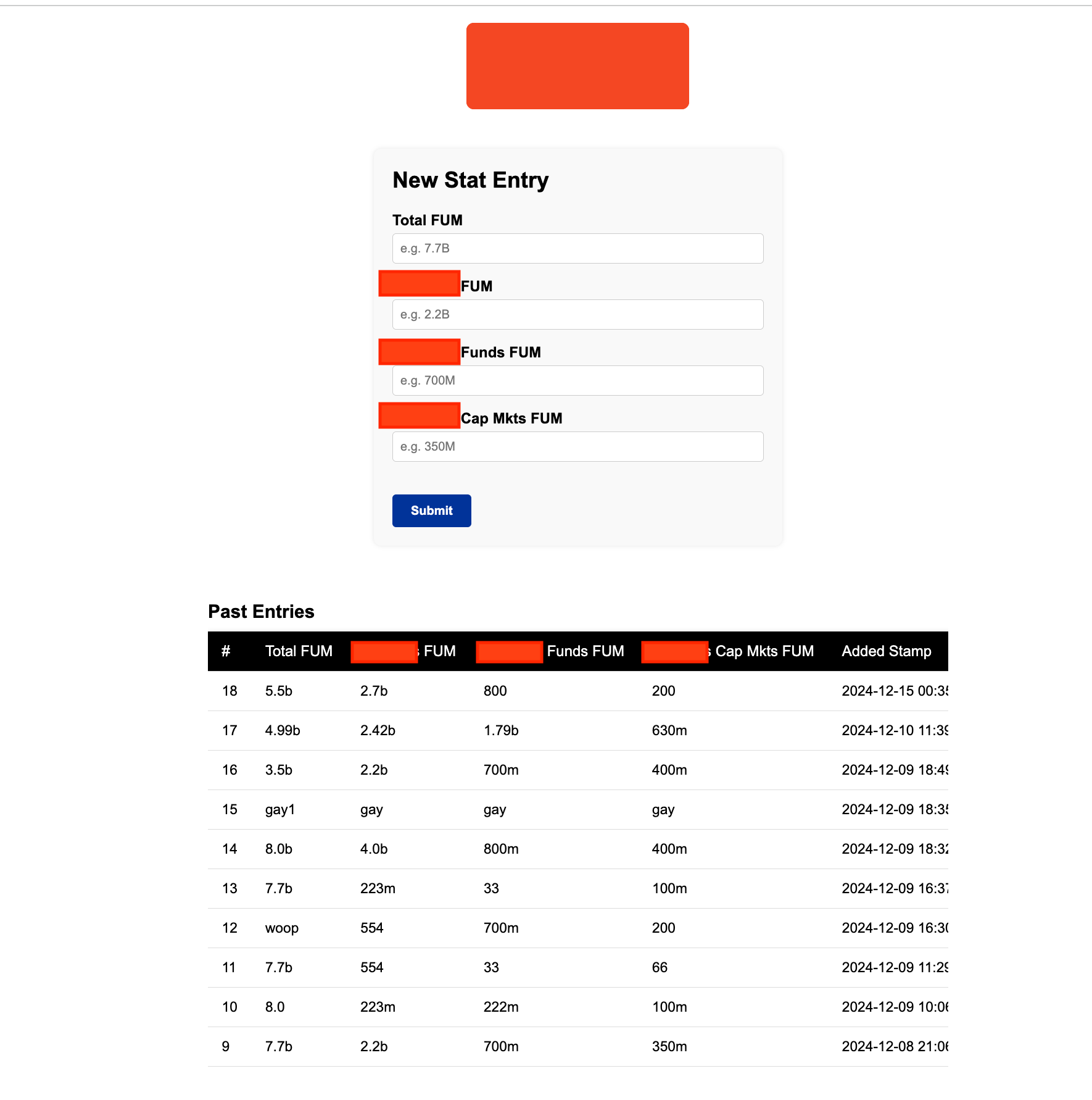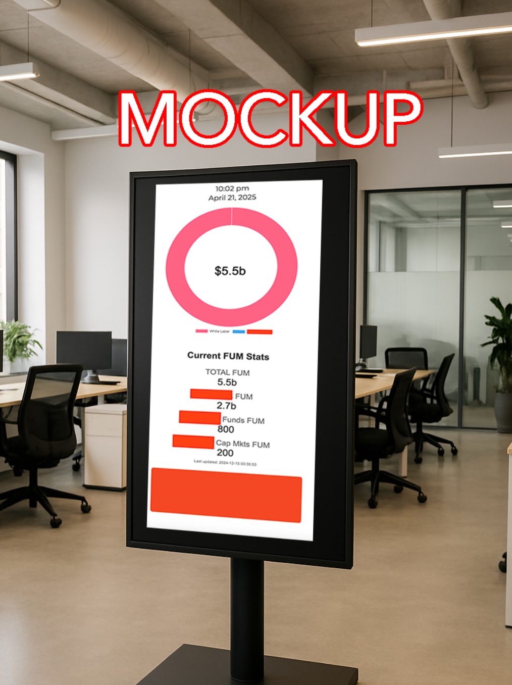 For my previous company, we did not have a proper way of communicating total FUM amount , thus i created a system that runs live, when the calculating user gets the correct FUM, they could login to the admin panel, enter the new amounts, and the platform auto calculates and pushes it live to the dashboard for people to see, whether on their computers on the LAN network OR the in office LED screen.